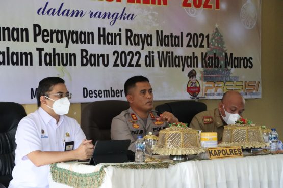 menitindonesia, MAROS – Kepala Kepolisian Resor (Polres) Maros, AKBP Fatur Rochman, menggelar kegiatan rapat koordinasi (rakor) lintas sektoral untuk pengamanan natal dan tahun baru pada Operasi Lilin 2021 bersama instansi terkait, di Aula Promoter Polres Maros, Selasa (21/12/2021).
