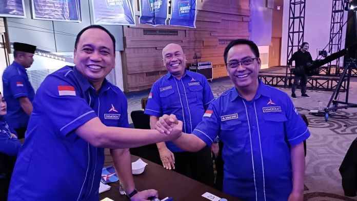 Taqyuddin dan Rahman Bando bersalaman kompak sebelum dilantik jadi Pengurus Demokrat Sulsel. (Foto: Ist)