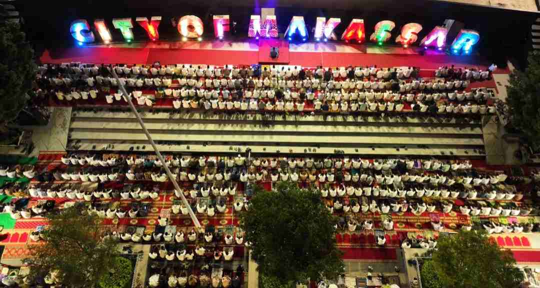 menitindonesia, MAKASSAR — Suasana jalan yang masih gelap gulit tidak menyurutkan langkah masyarakat untuk mengikuti salat Subuh berjemaah, di Anjungan City Of Makassar, Sabtu (15/4/2023).