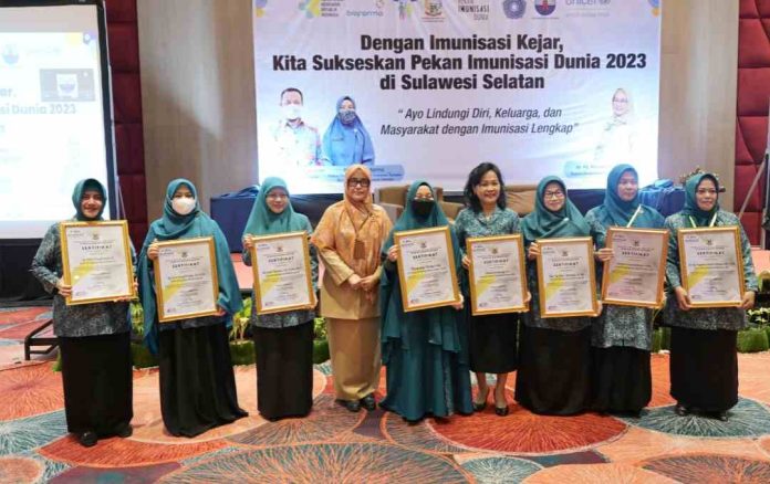 Penghargaan itu diserahkan langsung oleh Ketua TP PKK Provinsi Sulawesi Selatan, Naoemi Octarina, di sela-sela kegiatan pencanangan Pekan Imunisasi Dunia Tingkat Provinsi Sulawesi Selatan di Hotel Gammara, Selasa (9/5/2023).