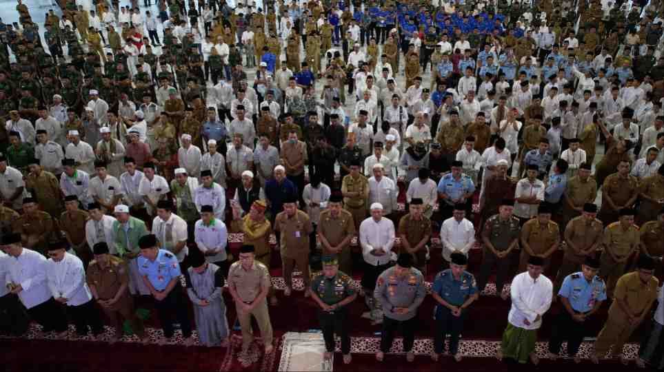 menitindonesia, MAKASSAR — Penjabat (Pj) Gubernur Provinsi Sulawesi Selatan (Sulsel), Bahtiar Baharuddin, melakukan shalawatan dengan ribuan masyarakat Sulsel, unsur TNI Polri, ulama, kepala daerah dan ribuan masyarakat Sulsel.