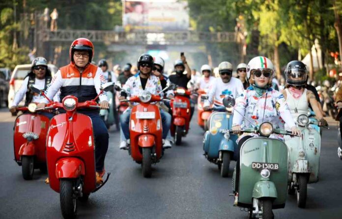 Hari Sumpah Pemuda ke-95 diperingati Wali Kota Makassar Moh Ramdhan Pomanto dan Wakil Wali Kota Fatmawati Rusdi dengan mengendarai motor vespa keliling Makassar bareng skuteris se-Sulawesi Selatan (Sulsel), Sabtu (28/10/2023) sore.