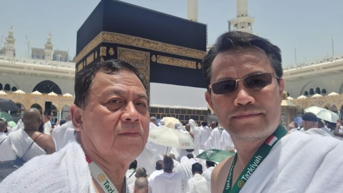 FOTO: Pengamat Politik dan Dosen Fisip Unhas Dr Hasrullah (kiri) dan Dosen UNM, Dr. M. Ridwan Tikollah, setelah berdoa di depan Ka'bah. (ist)