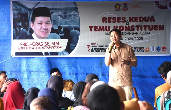 menitindonesia, MAKASSAR – Wakil Ketua DPRD Makassar, Eric Horas, kembali turun ke lapangan dalam agenda reses kedua masa persidangan 2024/2025. Kali ini, ia menemui konstituennya di dua titik, Jalan Faisal VI, Kelurahan Buakana, Kecamatan Rappocini, serta Jalan Raya Pendidikan, Kelurahan Tidung.