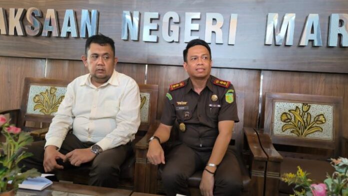 Kejari Maros, Febriyan (kiri) bersama Kasi Intelejen, Andi Unru (kanan) saat memberikan keterangan pers di kantornya. (bkr)