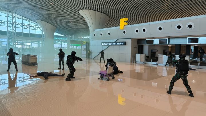 Dalam simulasi itu, sekelompok teroris menyandera 20 orang di lantai tiga ruang tunggu penumpang dan berencana membajak pesawat. Aparat berhasil melumpuhkan dua teroris dan menewaskan tiga lainnya. Pertukaran sandera juga dilakukan, termasuk penyelamatan seorang ibu hamil.