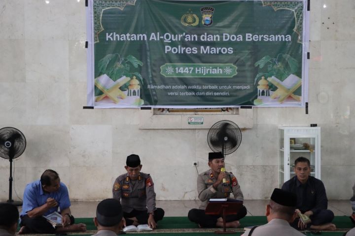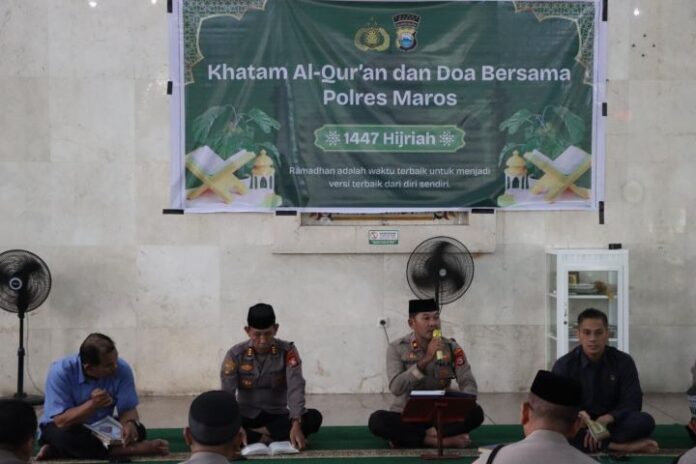 menitindonesia, MAROS – Dalam rangka meningkatkan keimanan dan ketakwaan di bulan suci Ramadan, jajaran Polres Maros menggelar Khatam Al-Qur’an yang diikuti personel di lingkungan Mapolres Maros, Kamis (5/3/2026).